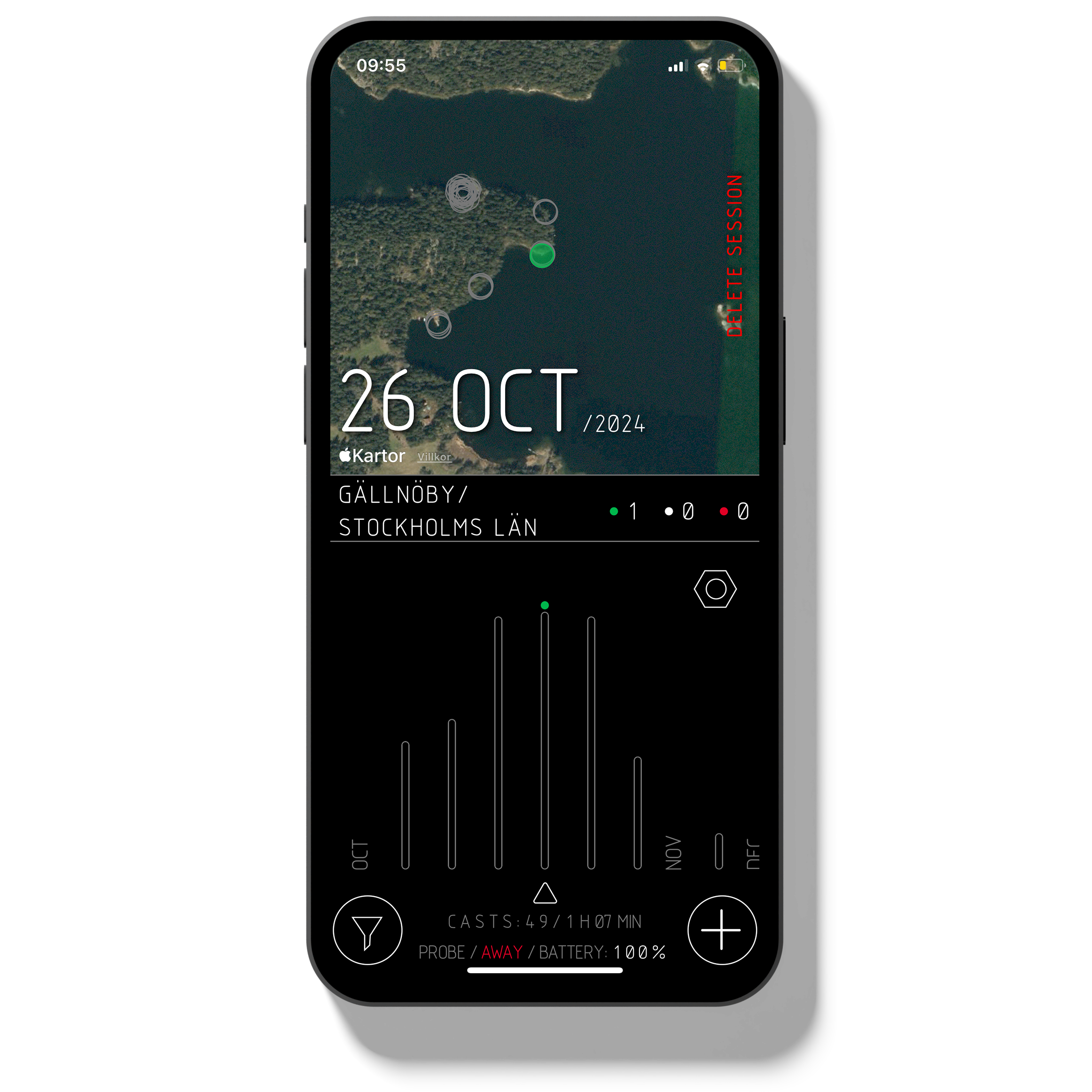 Let’s not turn fishing into a video game. You don’t have to watch your phone while you’re fishing. The app automatically logs every cast, even with your phone in your pocket. Check the data whenever you want; just to confirm your strategy, adjust on the spot, or save it all for later. Unlike other statistics, PROBE also records the casts where you didn’t catch anything, ensuring 100% coverage when planning your next adventure.